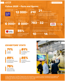 每年,来自欧洲和亚洲的纺织机械工程领域公认的领导者以及最先进技术的供应商都会参与展会。德国、意大利、西班牙、土耳其、韩国和中国的国家展区及展馆均定期参展。该活动获得国家关键部委及机构的支持,乌兹别克斯坦政府高层官员每年出席。CAITME已成为该地区所有行业专家年度日程中最重要且备受期待的盛会。CAITME每年吸引数千名来自中亚地区的纺织、针织及服装行业的专业人士、行业专家、企业高管及业主莅临参观。