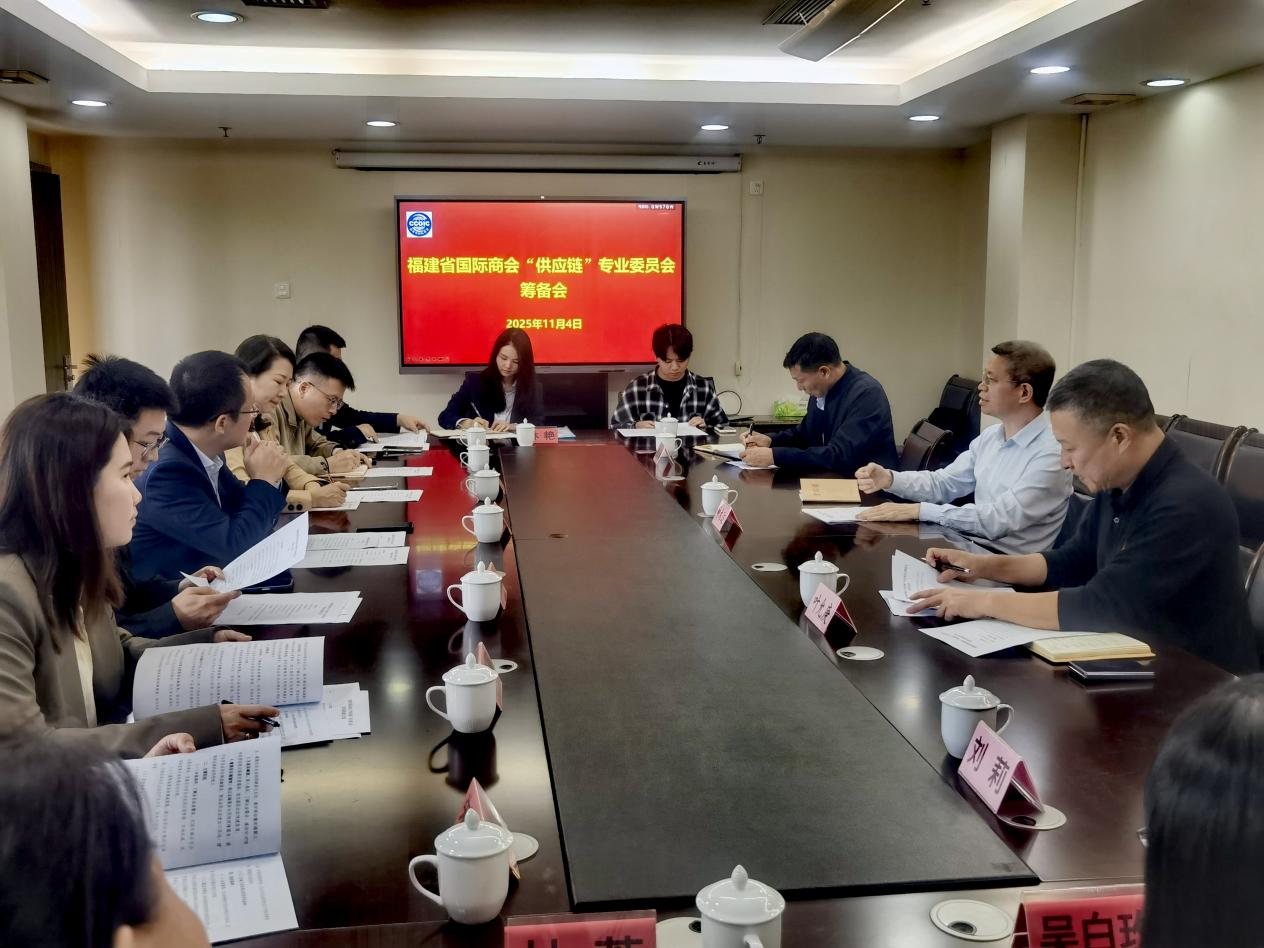 2025年11月4日上午,福建省国际商会“供应链”专业委员会筹备会议召开,省贸促会、省国际商会钟木达会长、专委会相关发起单位主要负责人以及省贸促会有关部室负责人参加会议。