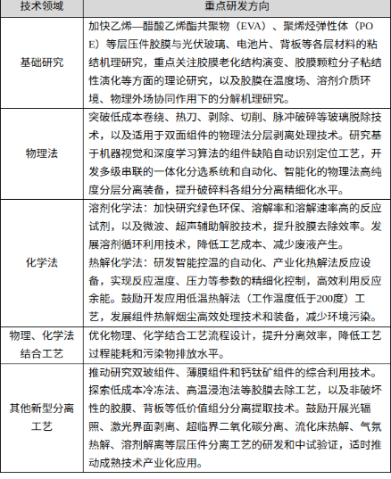 (二)突破高效分离工艺。开展光伏组件胶膜粘结机理研究,丰富完善胶膜低成本解离技术理论体系。加快研发晶硅单玻、双玻等组件的物理法、化学法、结合工艺及新型分离工艺,攻克光伏组件部件与胶膜的绿色、高效分离技术,鼓励开发非破坏性拆解技术,探索完整玻璃等材料获取路径。详见附件《高效分离工艺重点研发方向》。(工业和信息化部、生态环境部按职责分工负责)