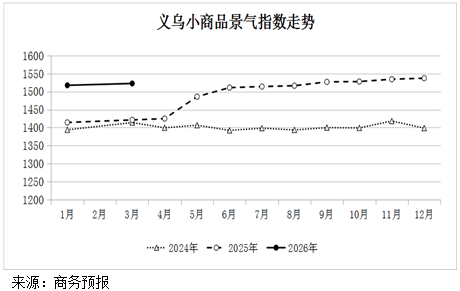 2026年3月份义乌小商品景气指数为1522.54点,比1月份环比上涨0.3%。其中,规模指数1900.21点,上涨3.3%;顾客人气指数1241.34点,上涨2.3%;商户信心指数1088.30点,上涨0.5%;资金活跃指数1469.02点,下降10.4%;物流服务指数1266.63点,下降12.8%。
