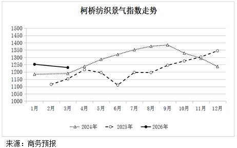 2026年3月份柯桥纺织景气指数为1230.10点,比1月份环比下降1.8%。其中,坯布类景气指数1307.78点,下降5.4%;家纺类景气指数1518.61点,下降4.8%;辅料类景气指数1845.86点,下降1.2%;原料类景气指数973.85点,下降0.5%;面料类景气指数1266.54点,上涨1.0%。